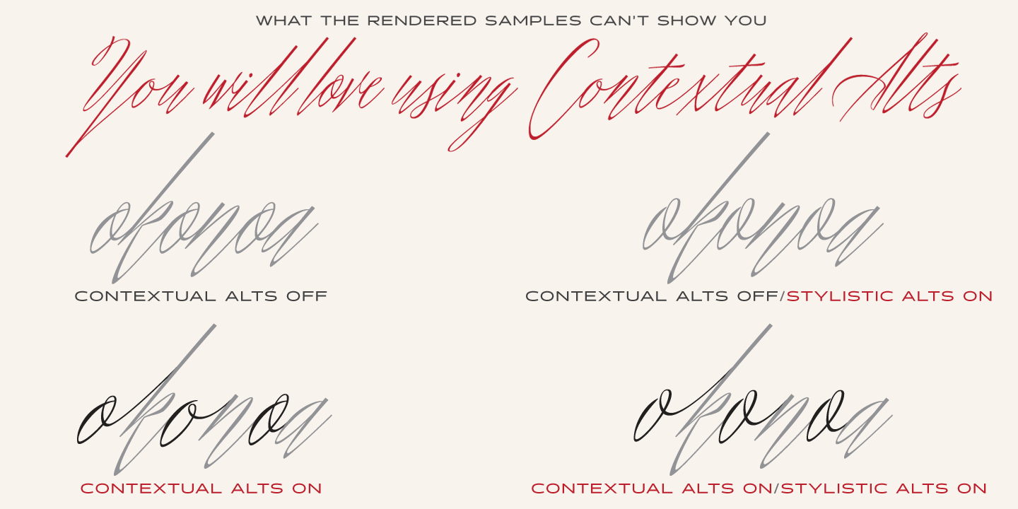 Shameless makes extensive use of Contextual alternates to create a proper ebb and flow from letter to letter. Interestingly, there are only a handful of ligatures… instead many special combinations are accounted for solely by relying on Contextual Alts. Mix in Stylistic Alts, Swashes, responsive Titling Alts, numerous Style Sets, etc and you can have a lot of fun. I created 2 versions. A ‘Standard’ version that has 2200+ characters and a ‘Deluxe’ version that has 2400+ characters and an interesting caveat… I plan on expanding the Deluxe version any time I have an idea to add to the typeface… and as such, buyers will receive all of those updates at no charge (with updates going directly to the distributors). You get what you pay for… no insane discounts.
